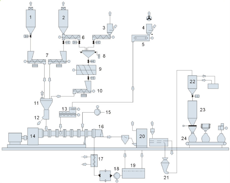 失重式配混喂料系統(tǒng)包括:原料儲罐、控制給料裝置,如提升機(jī)、滑道、泵以及秤或測壓元件、失重控制器或更確切地說是重量損失給料控制器??蛇x:例如攪拌器,以提高原料的分散度。